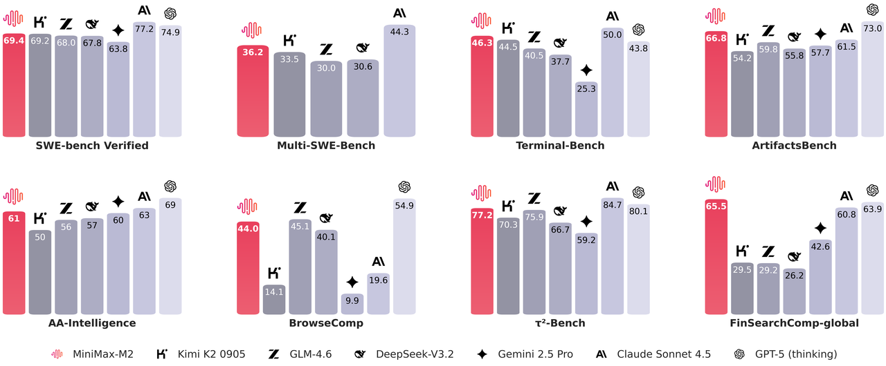 AA: All scores of MiniMax-M2 aligned with Artificial Analysis Intelligence Benchmarking Methodology (https://artificialanalysis.ai/methodology/intelligence-benchmarking). All scores of other models reported from https://artificialanalysis.ai/.