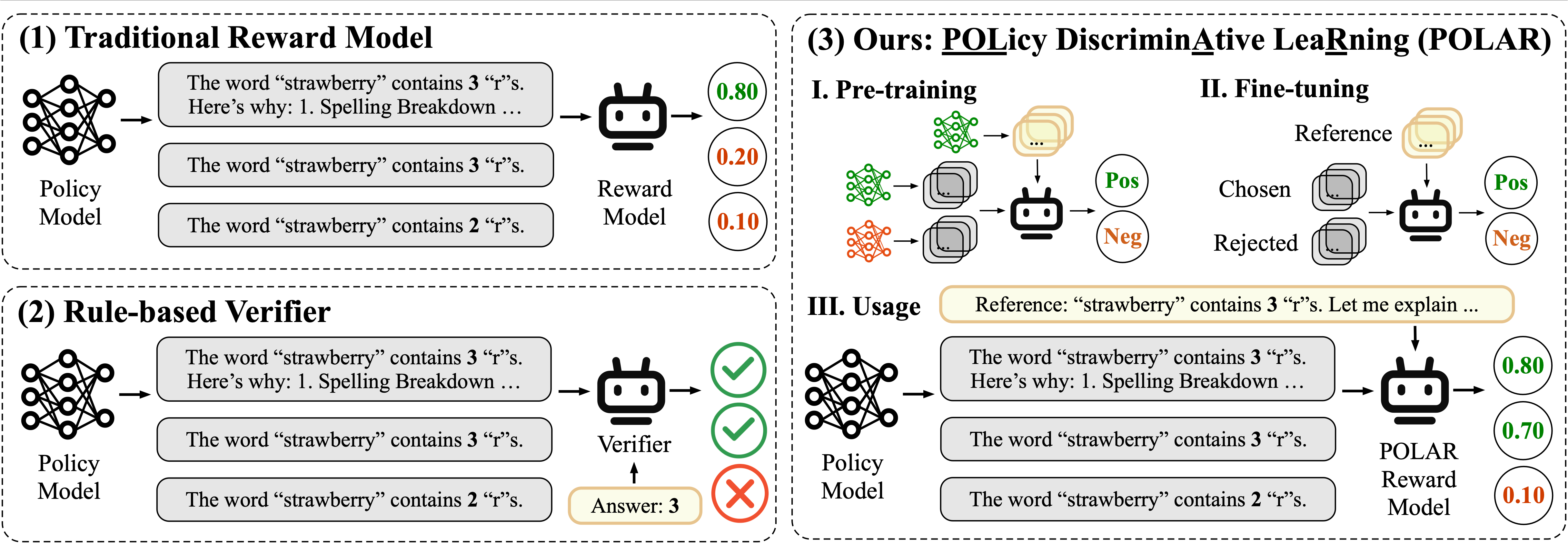 Tailored for Reinforcement Fine-tuning: POLAR assigns rewards to LLM trajectories based on given references, perfectly aligning with the Reinforcement Fine-tuning (RFT) framework. POLAR provides a promising solution for applying RFT in generic scenarios.