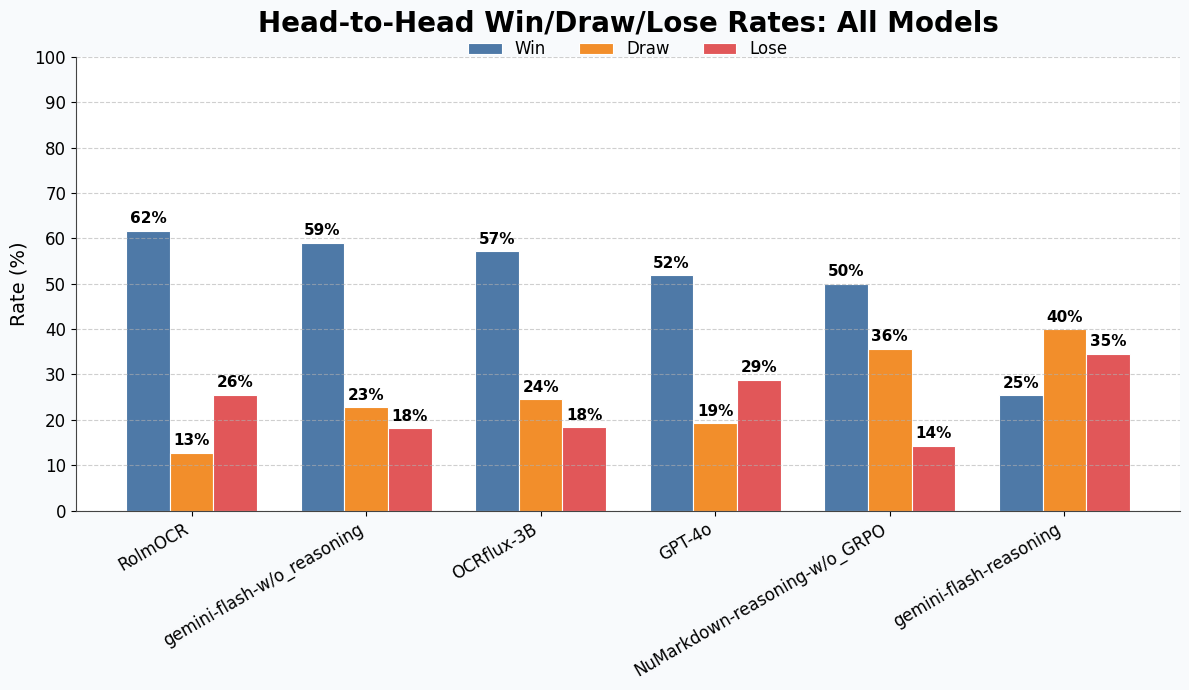 NuMarkdown-8B-Thinking is outperforming generic non-reasoning models like GPT-4o and specialized OCR models like OCRFlux. It is competitive against large reasoning closed-source models like Gemini 2.5.